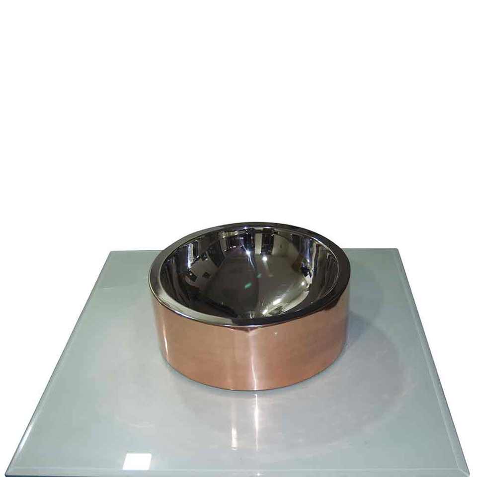 อ่างล้างจานทองแดงสองชั้นคุณภาพเยี่ยม ด้านในเคลือบนิกเกิล ด้านนอกทองแดงเงา ทรงกลม ใช้ร่วมกับก๊อกน้ำได้ ดีไซน์ทนทาน