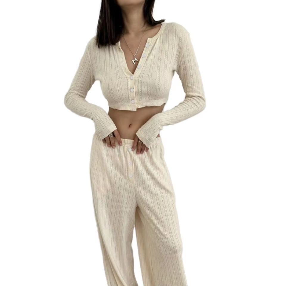 เซ็ตชุดนอนเลานจ์ติดกระดุมผ้านุ่มสบายสุดหรูชุดนอนแขนยาวผ้าเยื่อไม้ไผ่ระบายอากาศได้