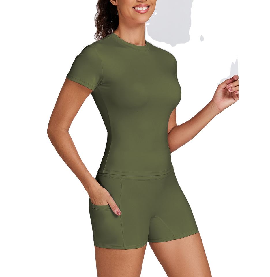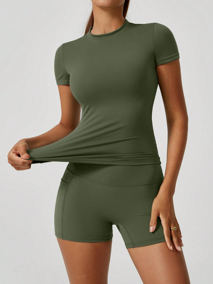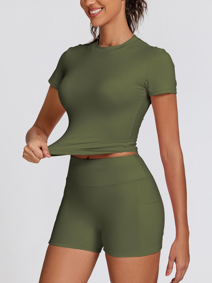 ชุดออกกำลังกายโยคะวิ่งไนลอนสีพื้นเนื้อนุ่มพิเศษสำหรับผู้หญิงเอวสูงยืดหยุ่นชุดกางเกงขาสั้นสองชิ้นชุดกีฬาชุดลำลอง