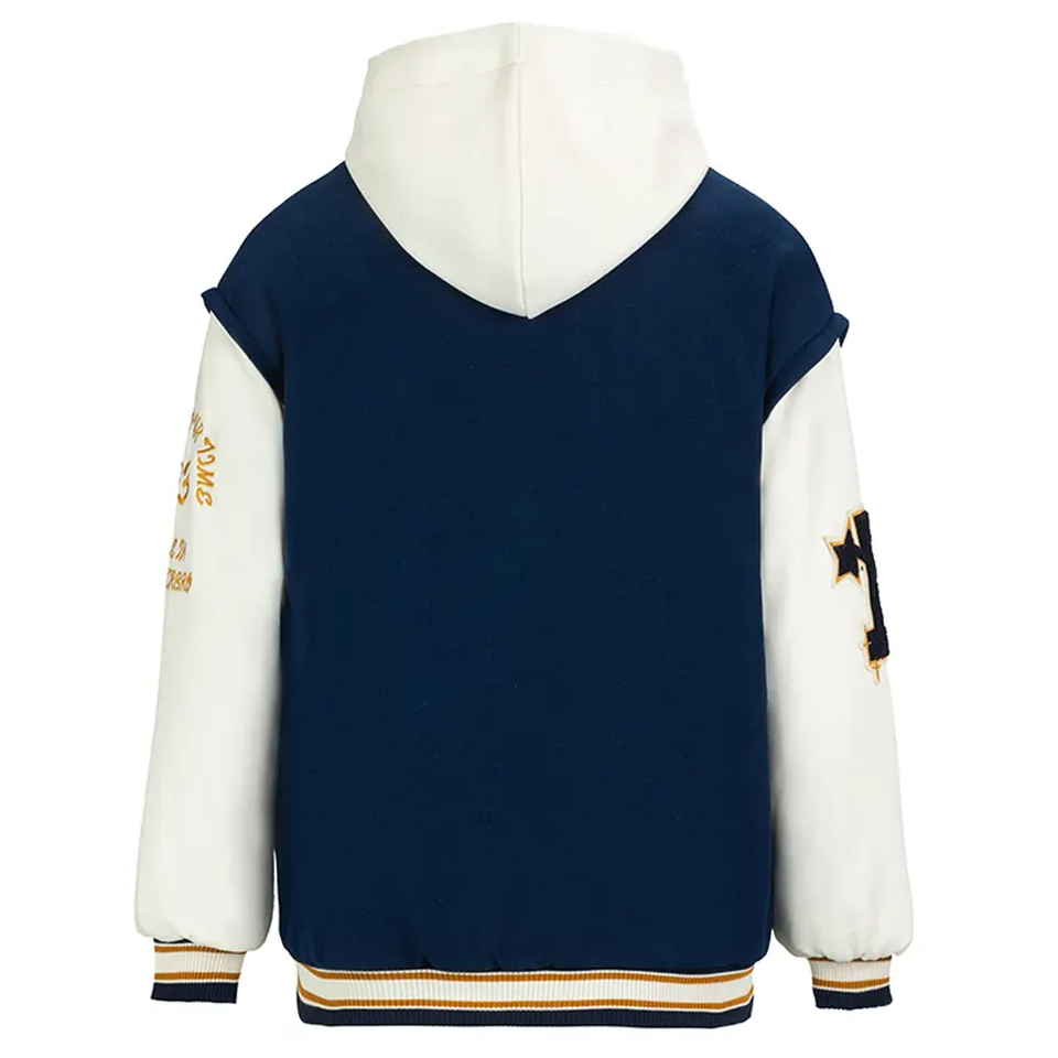แจ็คเก็ตผ้าขนสัตว์แขนเสื้อหนังแท้สีขาวสำหรับผู้ชายแจ็คเก็ตมหาวิทยาลัย