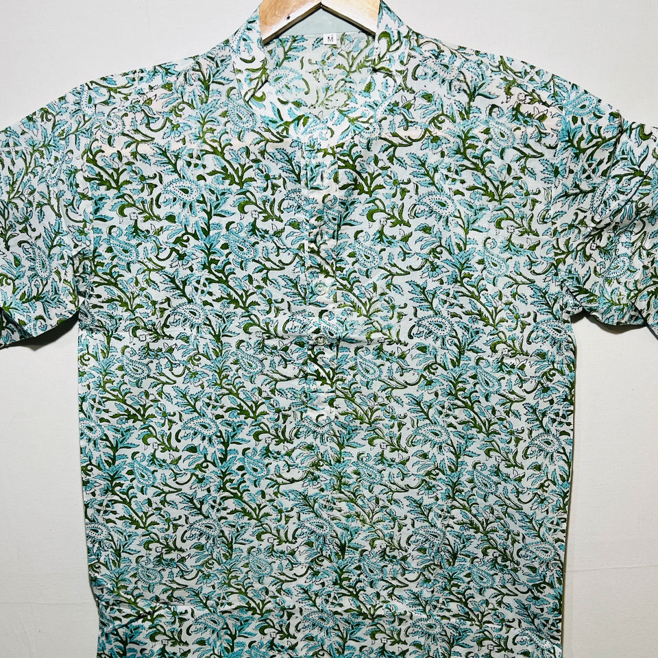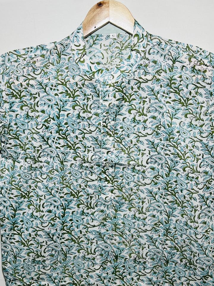ซูพีเรียร์ คราฟท์ เสื้อคุร์ต้าแขนสั้นสีเทอร์ควอยซ์ผ้าฝ้าย 100% สำหรับผู้ชาย | ชุดคุर्ตาลายดอกไม้พิมพ์ลายด้วยมือแบบคลาสสิกสำหรับนักออกแบบ
