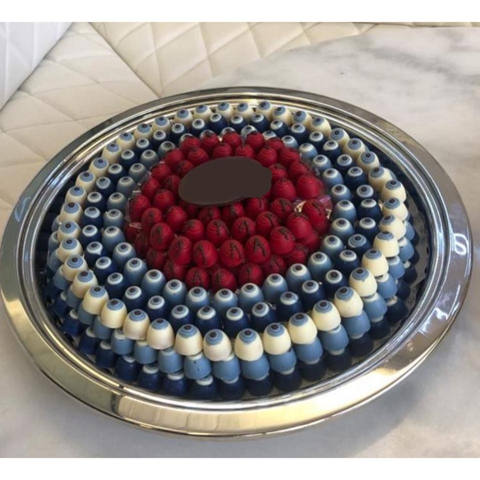 ถาดช็อคโกแลตทรงกลมโลหะสีทองงานทำมือถาดเสิร์ฟขนมสมัยใหม่สำหรับงานแต่งงานและงานอีเวนต์