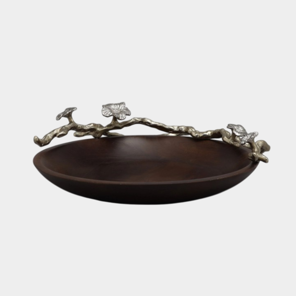 ชามเสิร์ฟอาหารตกแต่งด้วยวัสดุไม้มะม่วงพร้อมชามสลัดเน้นดอกไม้สีเงิน