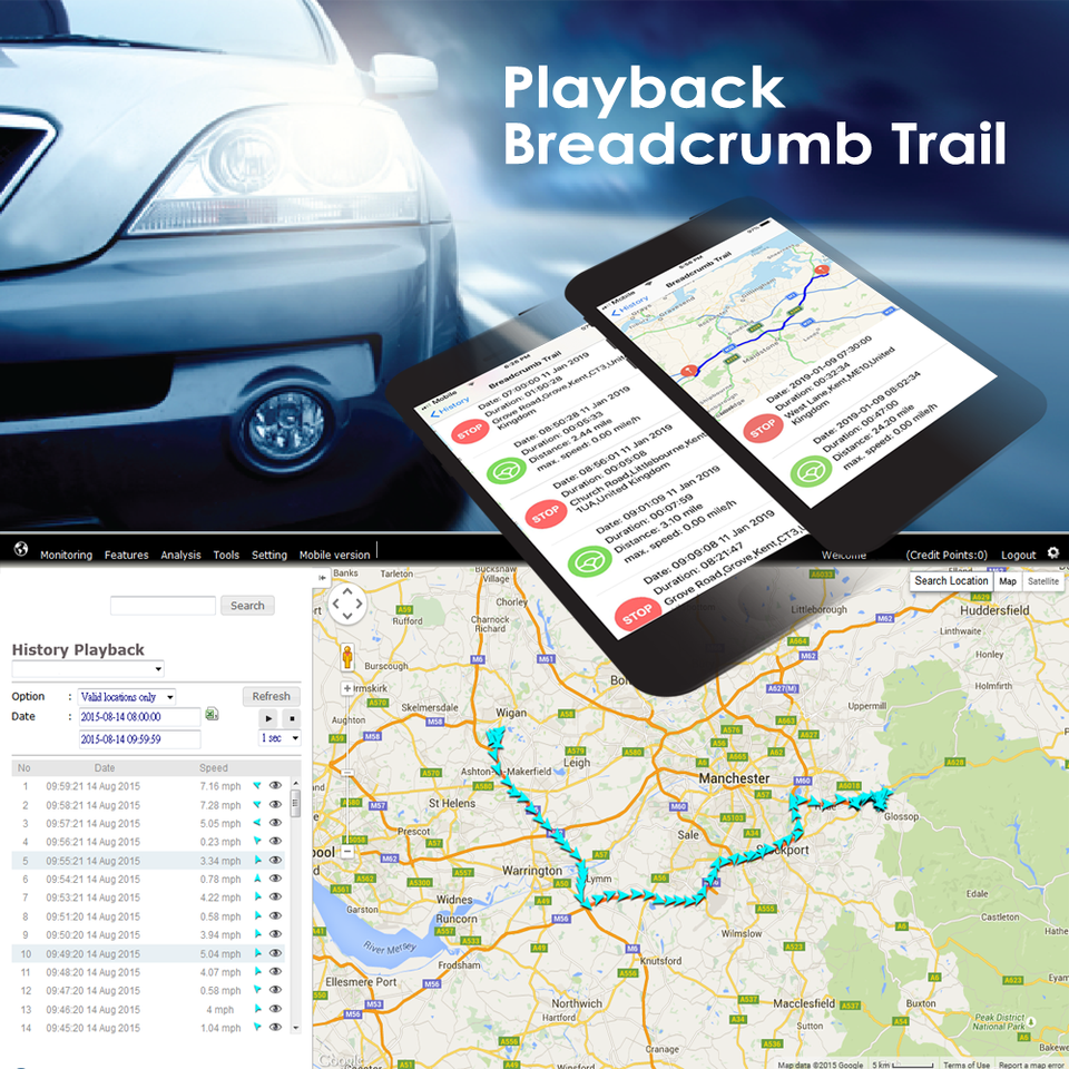 การรวมกัน:การติดตามแบบเรียลไทม์, เส้นทาง Breadcrumb, รั้วทางภูมิศาสตร์, รายงานการเดินทาง