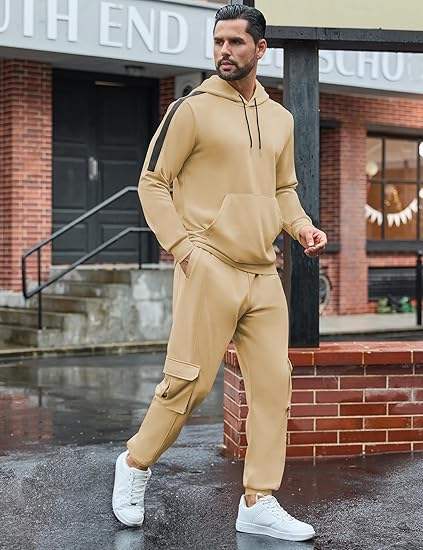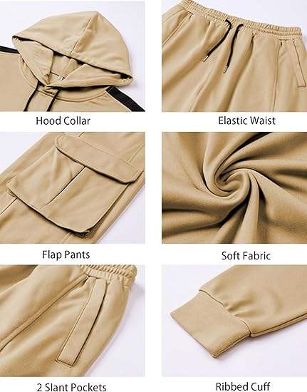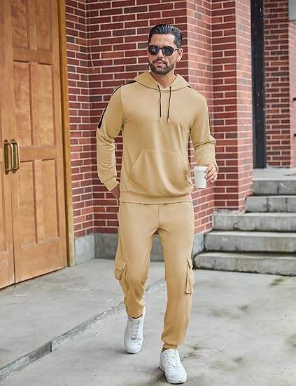 ชุดวอร์มผู้ชายแบบ 2 ชิ้น เสื้อฮู้ดและกางเกงขายาวทรงคาร์โก้ ชุดออกกำลังกาย ชุดวิ่ง ชุดยิม