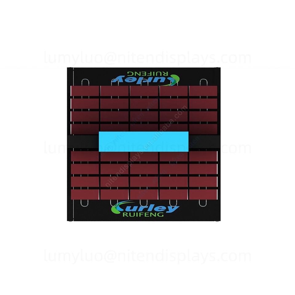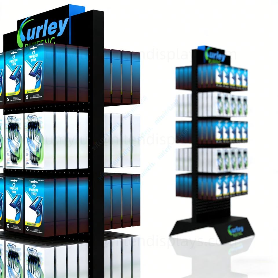 ชั้นวางสินค้าในซูเปอร์มาร์เก็ตแบบตั้งพื้น พร้อมตะขอโลหะสองด้าน สำหรับแขวนมีดโกน แปรงโกนหนวด และสินค้าอื่นๆ ที่สามารถแขวนได้