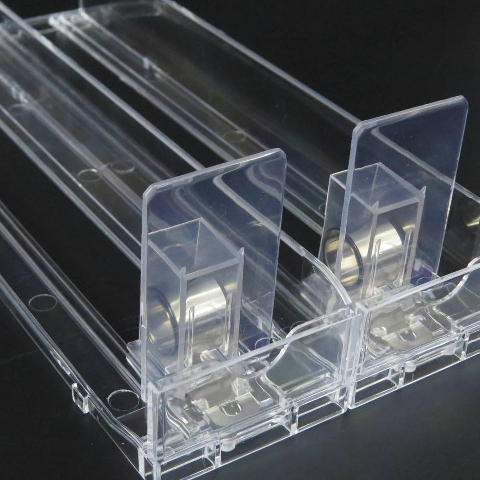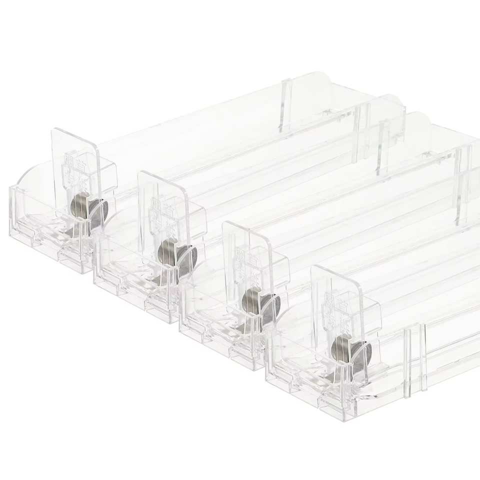 ชั้นวางขวดแบบปรับได้ระบบผลักแบบแบ่งชั้นพลาสติกซูเปอร์มาร์เก็ต