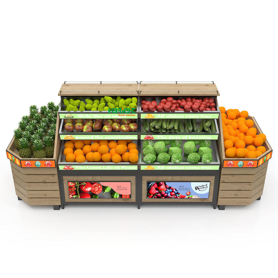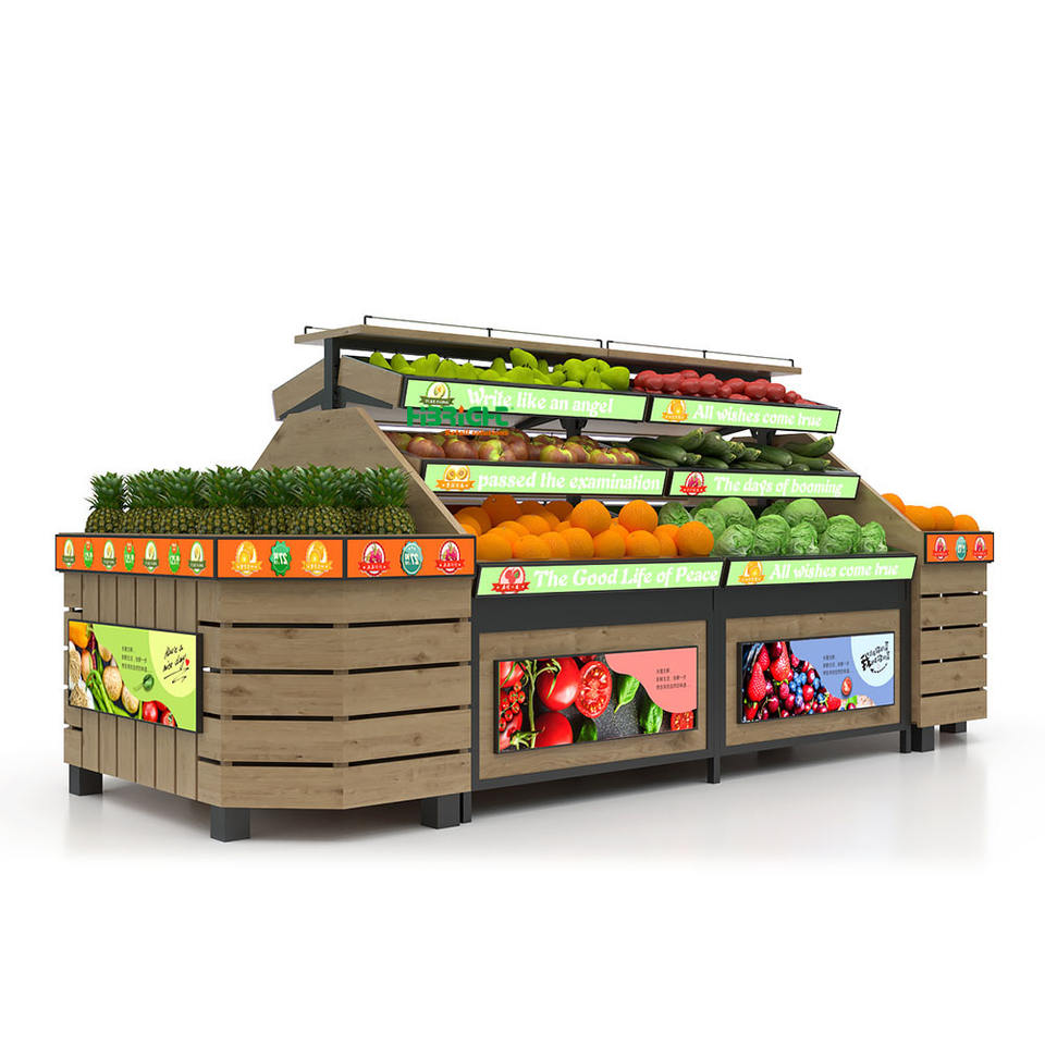 ชั้นแสดงสินค้าแบบไม้และผักสองด้านใช้สำหรับจัดแสดงสินค้าในซูเปอร์มาร์เก็ต