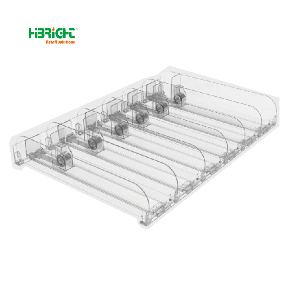 ชั้นวางสินค้าแบบมีล้อเลื่อนสำหรับซุปเปอร์มาร์เก็ต Hibright HBE-POP ชั้นวางพลาสติกแบบใช้แรงโน้มถ่วงสำหรับตู้แช่เย็น ตู้แช่แข็ง ชั้นวางโชว์สินค้า