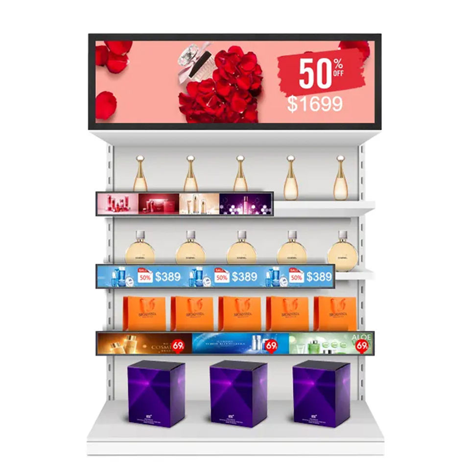 จอ LCD แบบยืดออกหน้าจอแสดงผลบนบาร์จอขนาดแถบสำหรับโฆษณาทางวิดีโออัจฉริยะสำหรับร้านค้าปลีกซูเปอร์มาร์เก็ต
