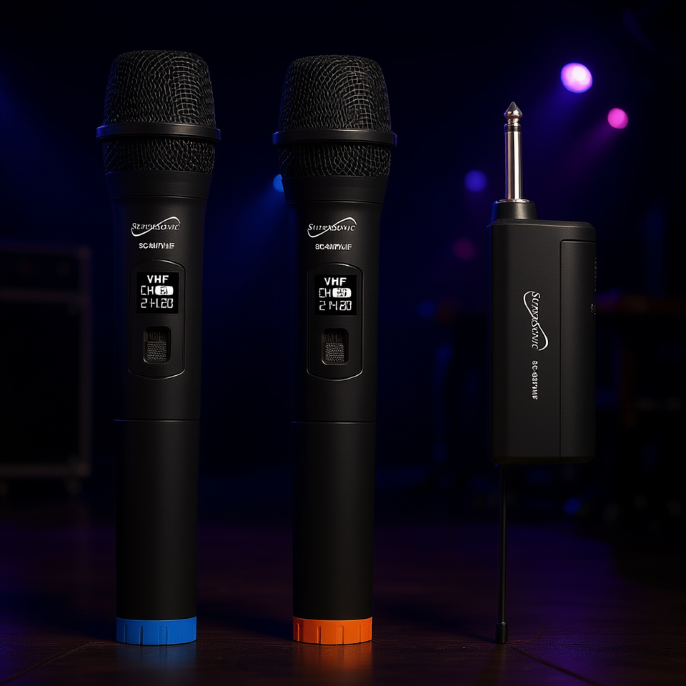 ไมโครโฟนไร้สายแบบสองช่องสัญญาณซูเปอร์โซนิค VHF ความถี่คงที่ ไมค์เสียงระดับมืออาชีพ พร้อมตัวรับสัญญาณและอุปกรณ์เสริม