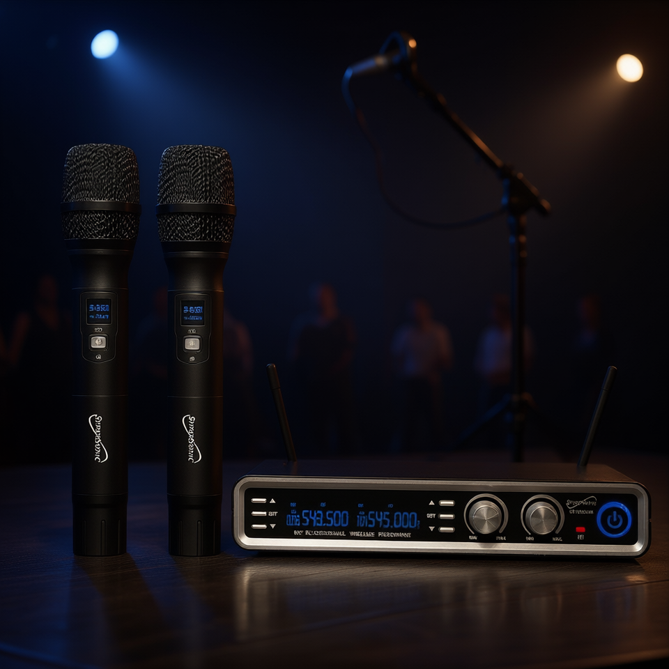 ไมโครโฟนไร้สาย UHF ระดับมืออาชีพ Supersonic แบบสองช่องสัญญาณ เลือกความถี่ได้ สีดำ รุ่น D0100H5CKET