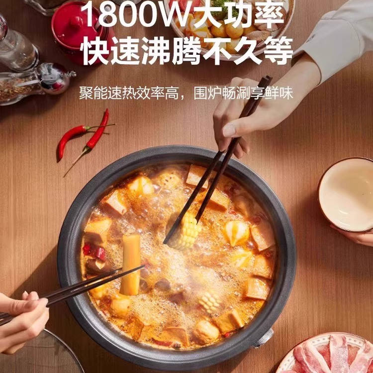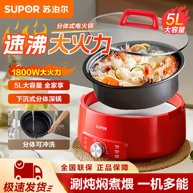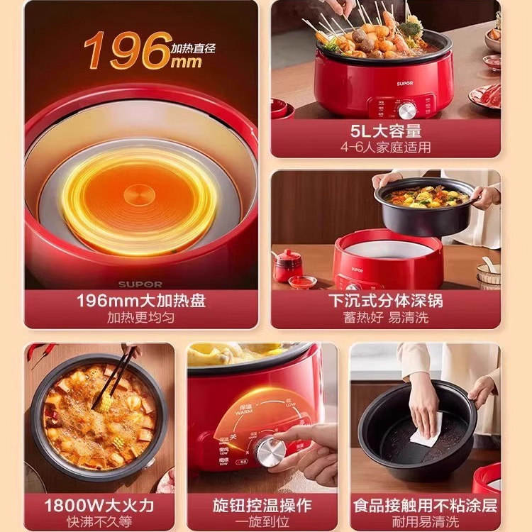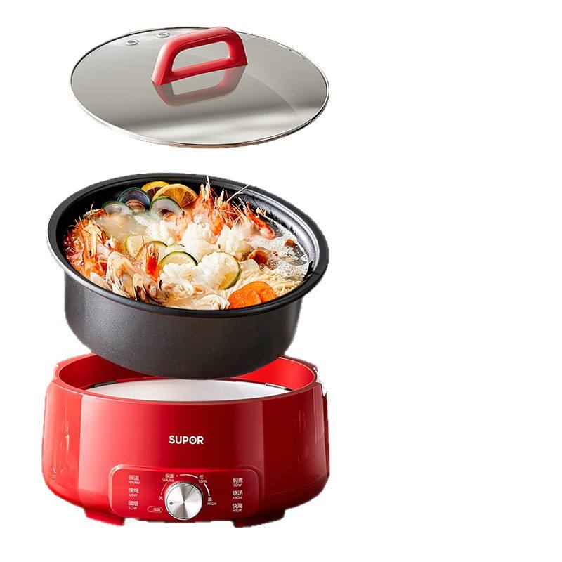 หม้อไฟฟ้าซูปเปอร์ 5 ลิตร ทรงกลม สีแดง เคลือบกันติด ถอดประกอบได้ สำหรับทอด ตุ๋น ต้ม ใช้ในครัวเรือน
