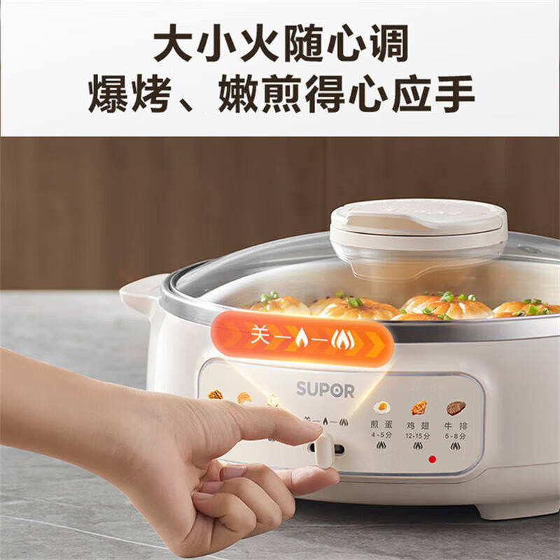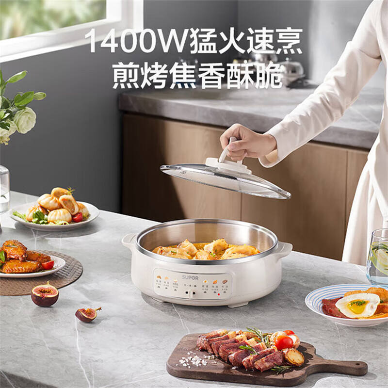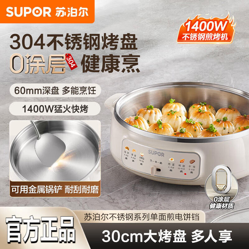 ซูปอร์กระทะไฟฟ้า 304 สแตนเลสสตีลทรงกลมอเนกประสงค์กระทะไม่ติดสำหรับย่างและอบ