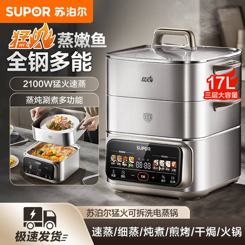 ซูปอร์หม้อนึ่งไฟฟ้า 17 ลิตร สามชั้น 304 สแตนเลสสตีล หม้อปรุงอาหารในครัวเรือนความจุขนาดใหญ่