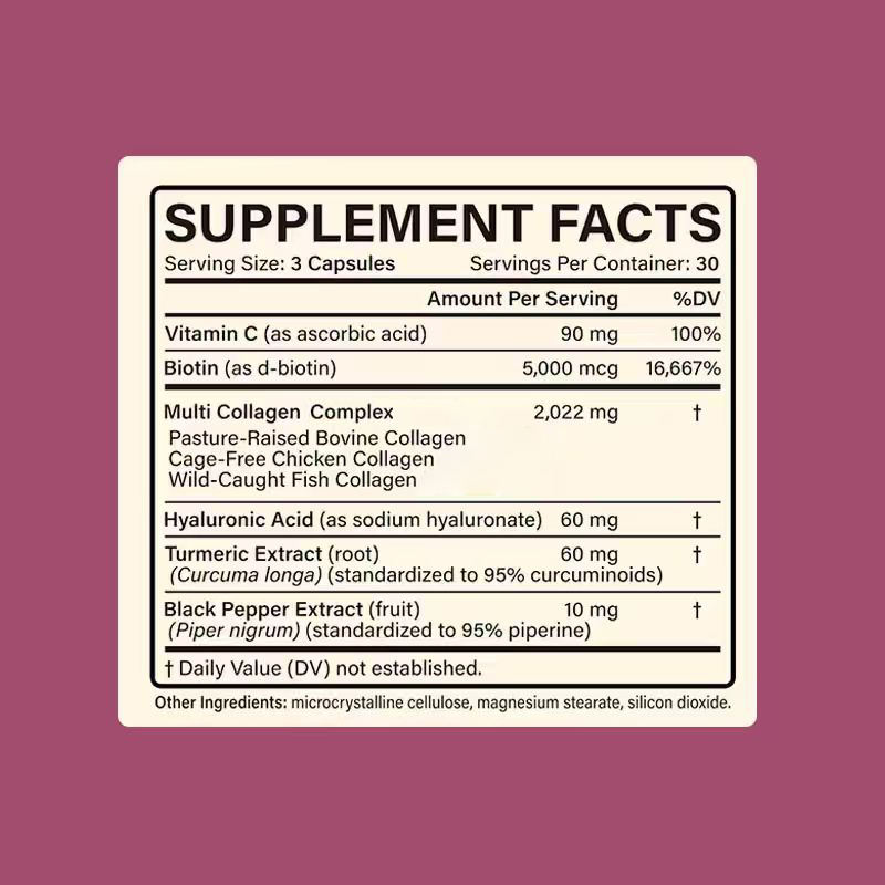 วิตามินซี, ไบโอติน, มัลติ คอลลาเจน เปปไทด์ คอมเพล็กซ์, กรดไฮยาลูโรนิก, สารสกัดขมิ้นชัน, สารสกัดพริกไทยดำ