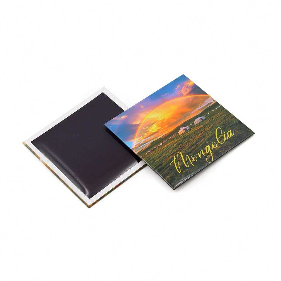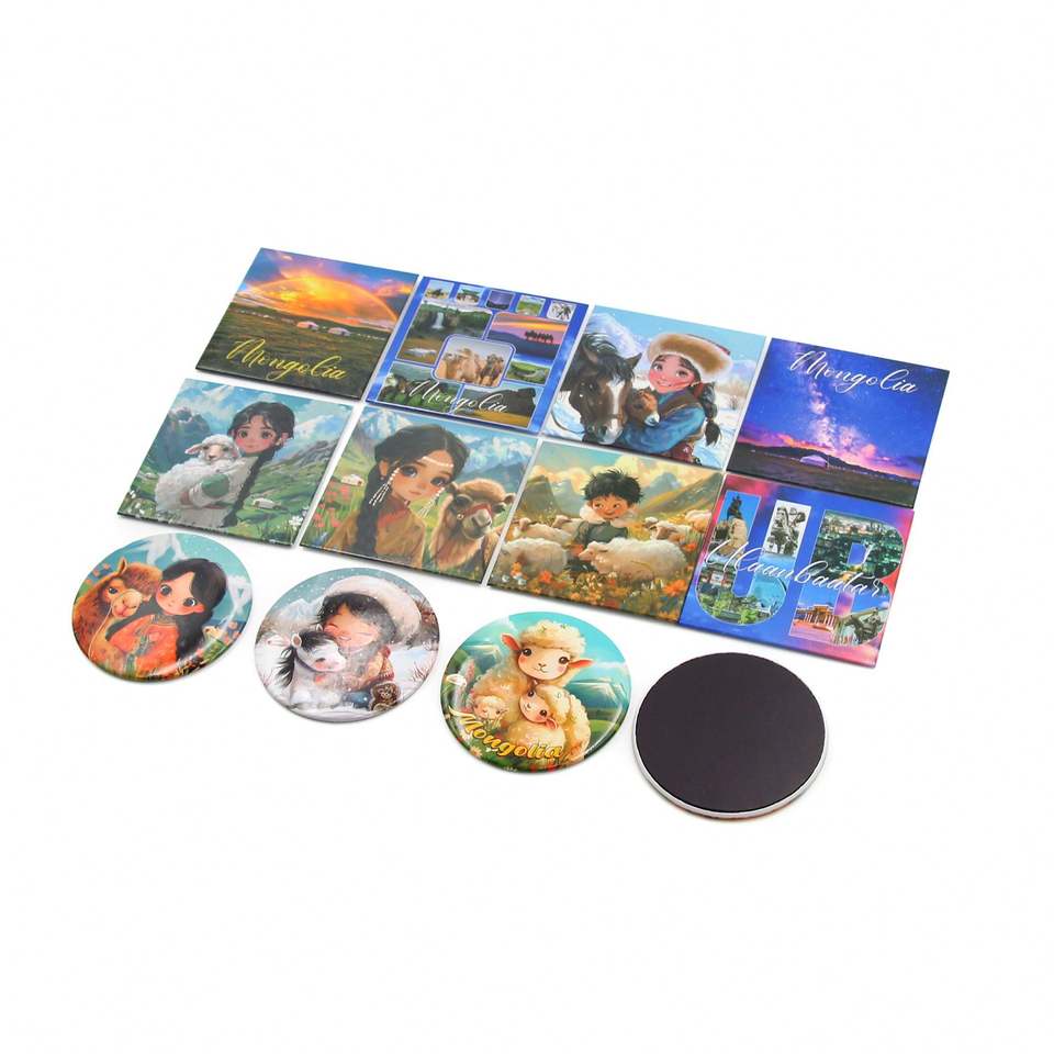 แม่เหล็กติดตู้เย็นรูปทรงสี่เหลี่ยมและทรงกลมราคาถูกจากซัพพลายเออร์ ขนาด 50*50 มม. แม่เหล็กติดตู้เย็นแบบแบน ของที่ระลึกจากมองโกเลีย