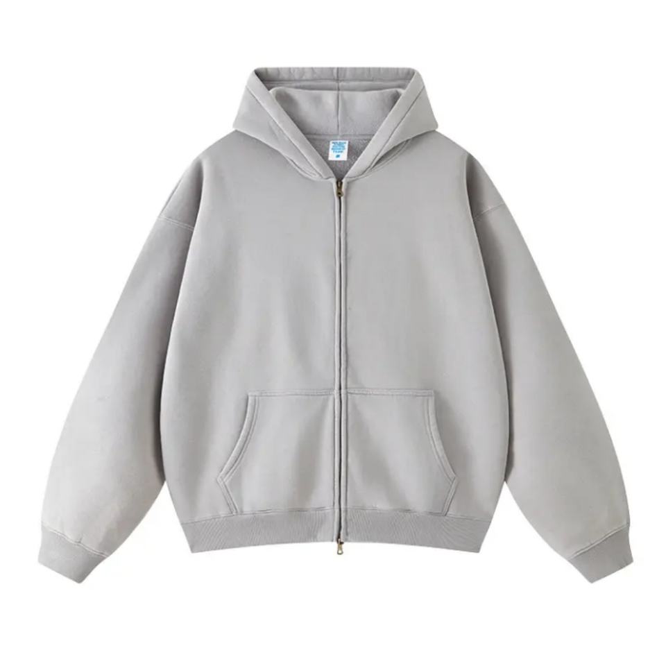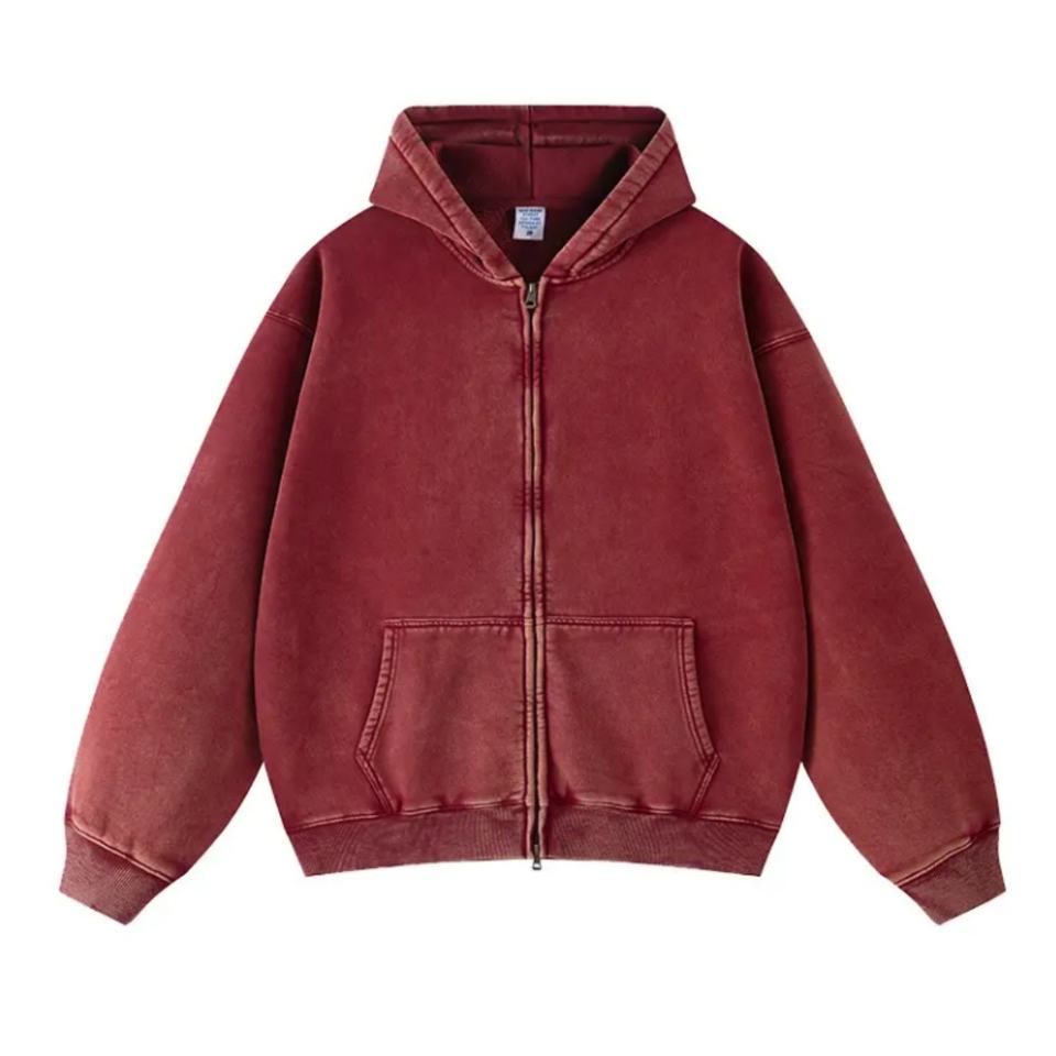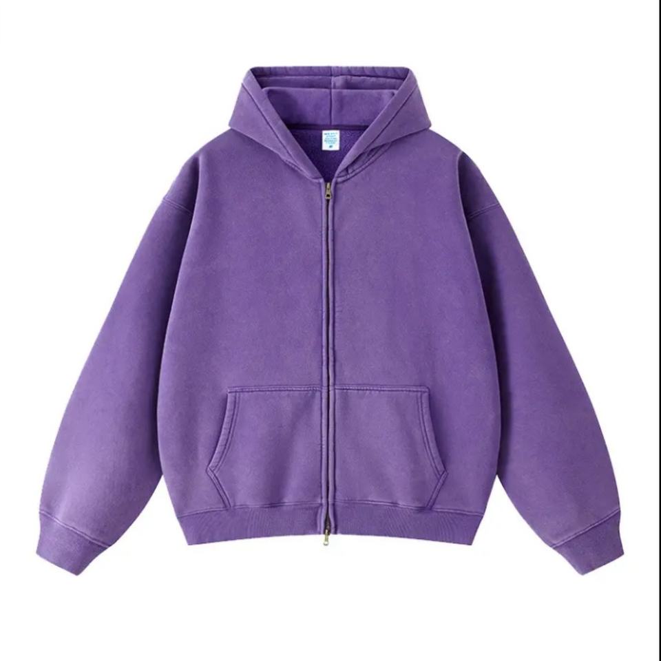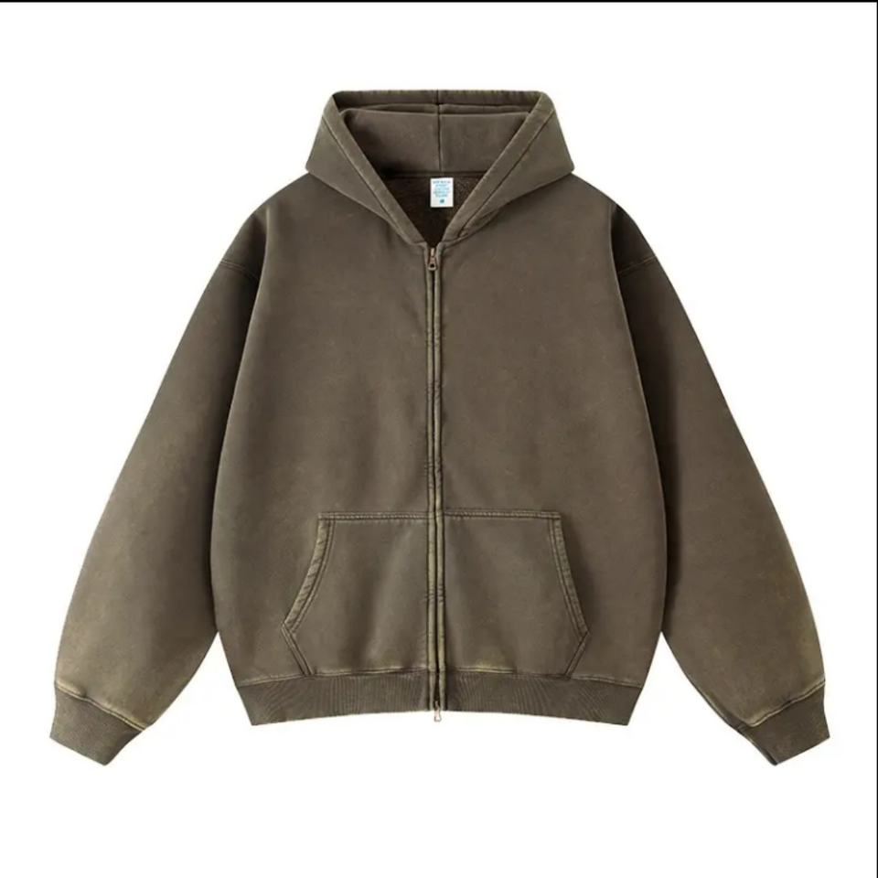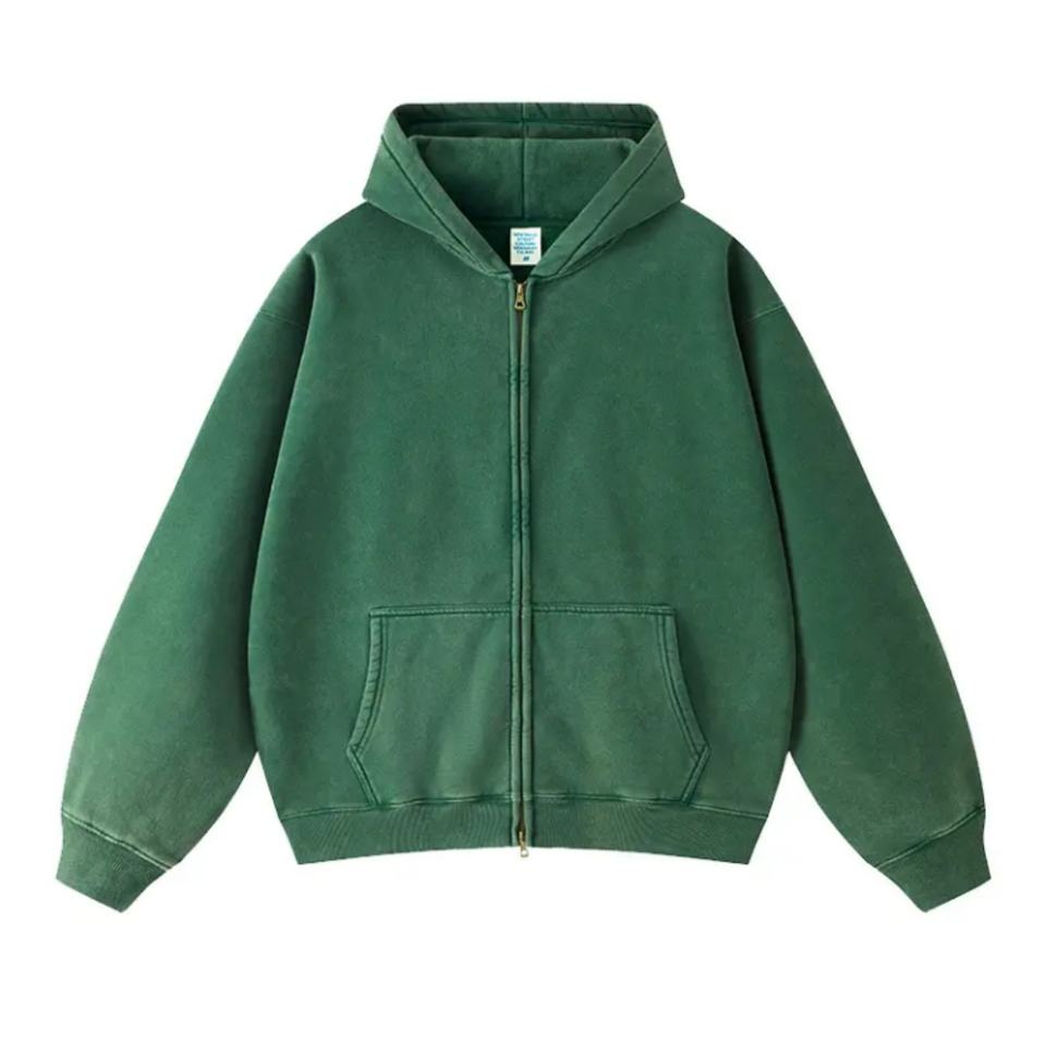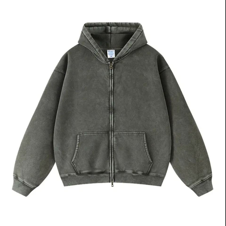 เสื้อฮู้ดดี้ผู้ชายผ้าฝ้ายคุณภาพสูงทรงหลวมแบบดรอปโชว์เดอร์ สไตล์วินเทจ แต่งแพทช์ ซีดจางแบบโดนแดด ซิปหน้า ลุคซักฟอก