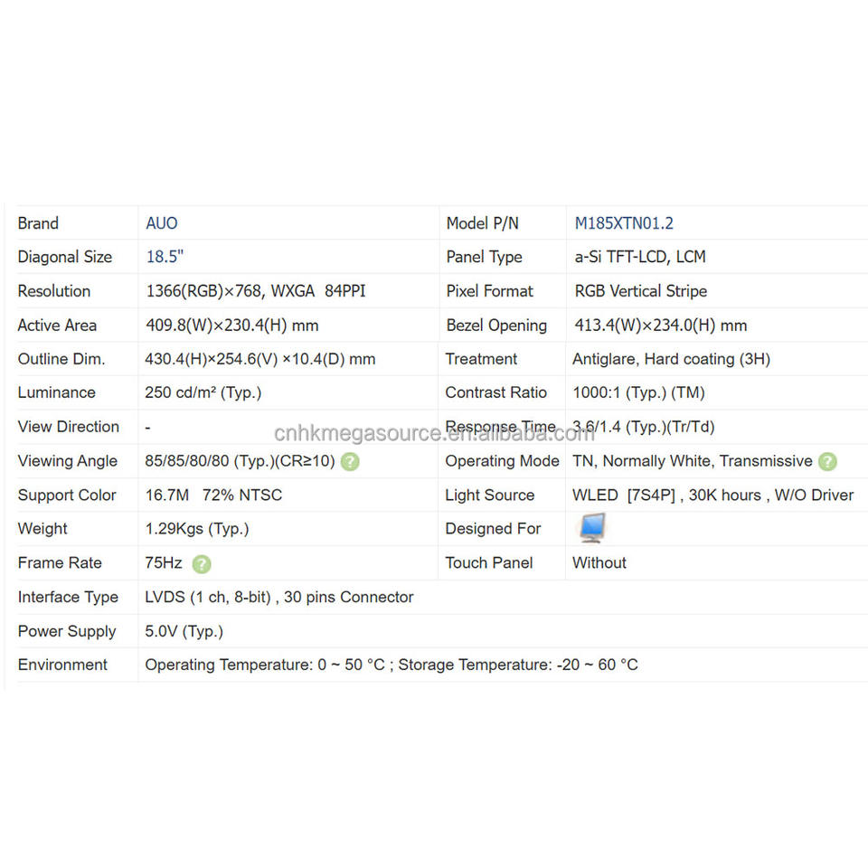 ซัพพลายเออร์จอ LCD รุ่น M185XTN01.2 ขายส่งจอ LCD ขนาด 18.5 นิ้ว ความละเอียด 1366*768 โมดูลคริสตัลเหลว จอแสดงผล tft lcd