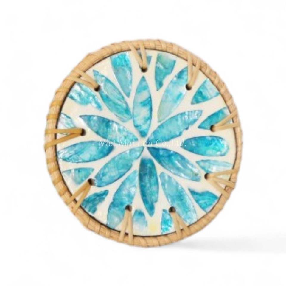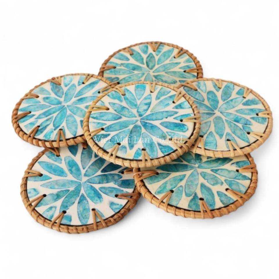 แผ่นรองแก้วทำจากมุกธรรมชาติขอบหวาย สำหรับตกแต่งบ้านและเสิร์ฟเครื่องดื่ม จำหน่ายจำนวนมาก