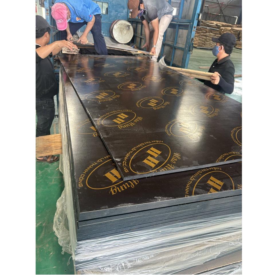 ไม้อัดฟิล์มฟิล์มเคลือบสีน้ำตาล/ดำ ขนาด 8x4 มม. หนา 12-15-18 มม. สำหรับงานก่อสร้างภายในอาคาร ใช้ซ้ำได้ 10 ครั้ง จากซัพพลายเออร์ เวียดนาม เกรด E1 A2 ขัดเงา