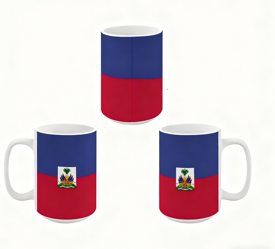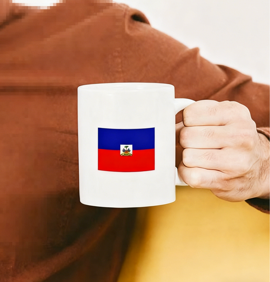 แก้วกาแฟเซรามิกขนาด11ออนซ์ของที่ระลึกถ้วยชาเซรามิกสีขาวพิมพ์ลายธงเฮติสำหรับทำกิจกรรม