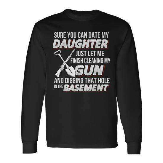 แน่ใจว่าคุณสามารถวันที่ลูกสาวของฉันปืนพลั่วหลุมฝังศพเสื้อยืดแขนยาว