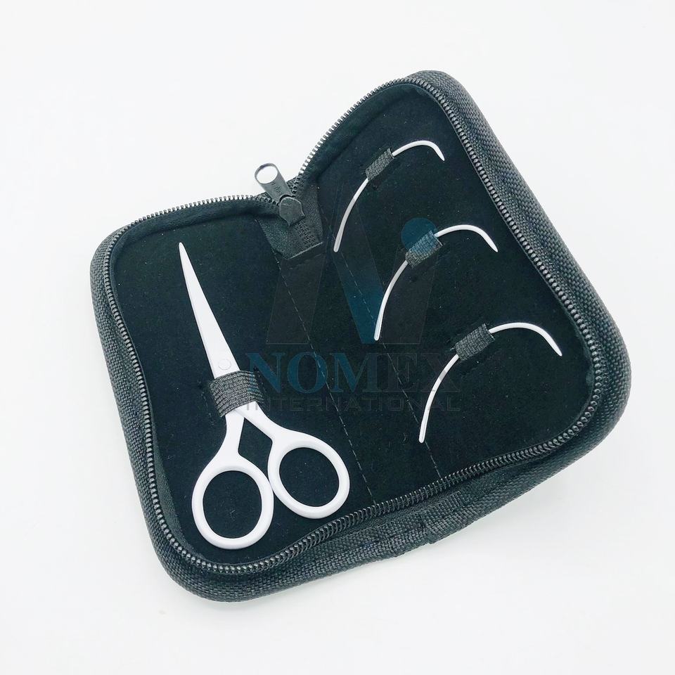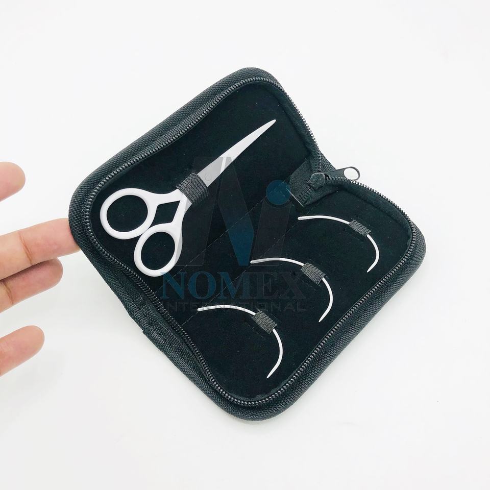 เครื่องมือต่อผมสแตนเลสเกรดผ่าตัด กรรไกรตัดด้ายขนาดเล็กพร้อมเข็มรูปตัว C ในซองเร็กซีน พร้อมโลโก้สั่งทำ