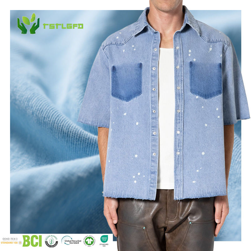 เสื้อผ้าผ้ายีนส์แขนสั้นสำหรับผู้ชายเสื้อเชิ้ตผ้าเดนิมแขนสั้นผ้าฝ้าย100% กางเกงบ็อกซี่ออกแบบได้ตามที่ต้องการ
