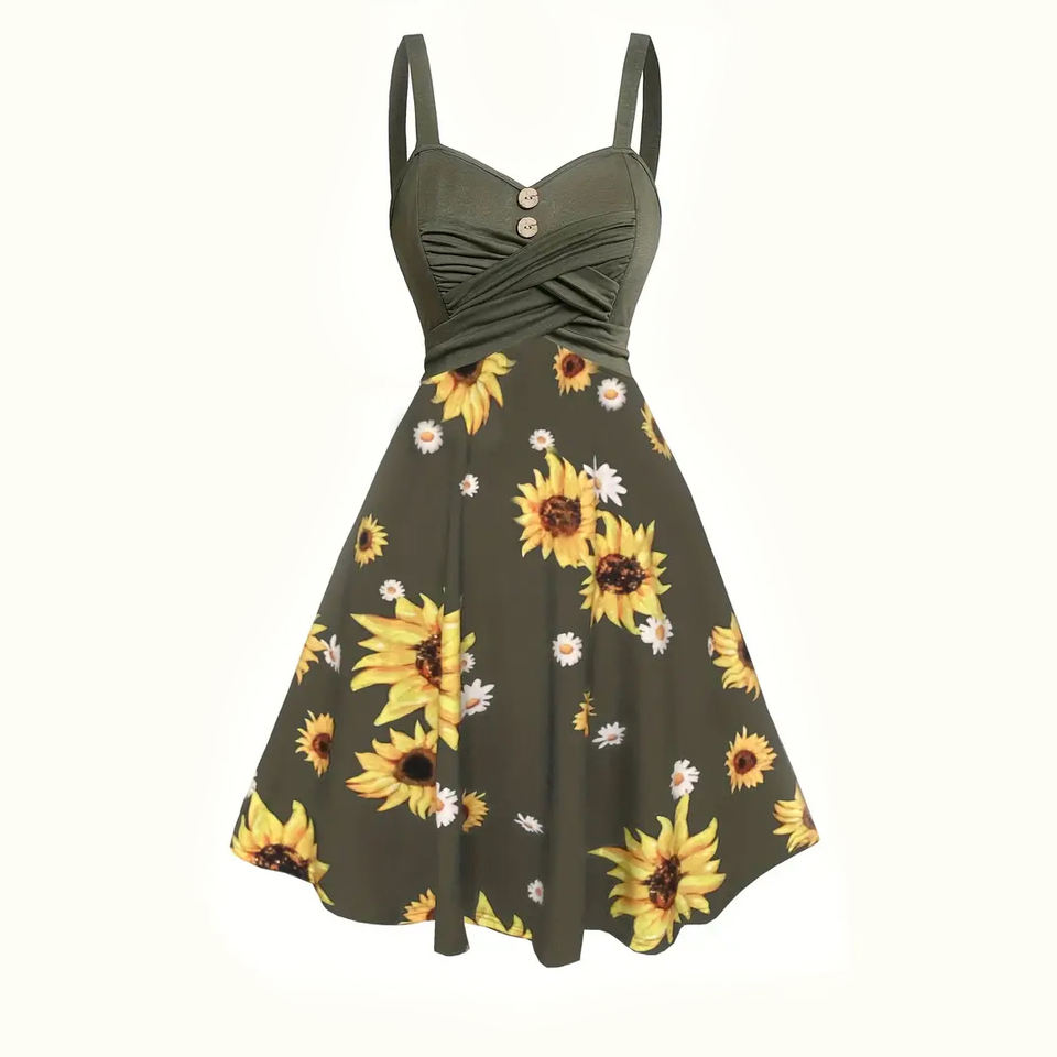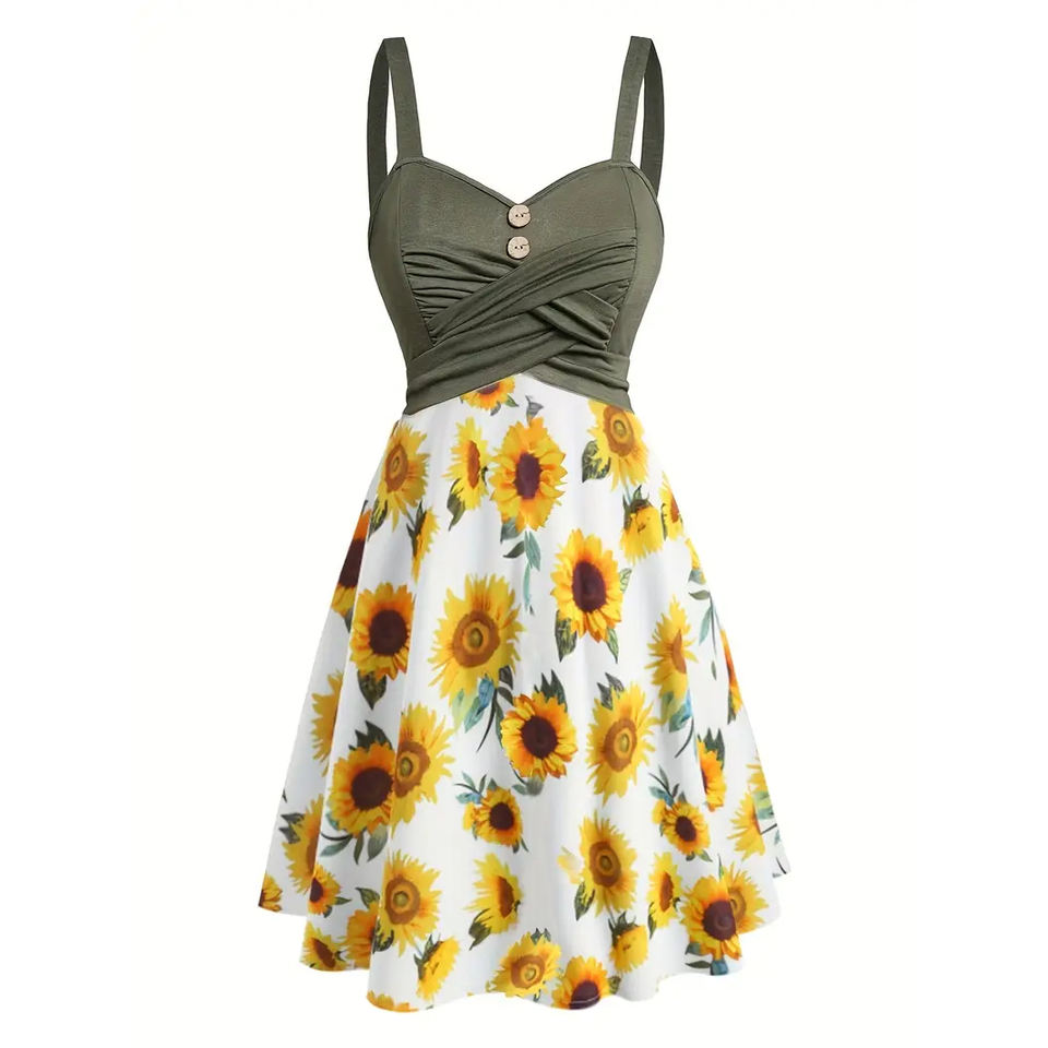 เดรสทรงเอไลน์ลายดอกทานตะวัน แขนสั้น ป้องกันริ้วรอย เป็นมิตรต่อสิ่งแวดล้อม ยั่งยืน คอวี เอวธรรมชาติ สำหรับงานที่เป็นทางการ พิมพ์ลายดิจิทัล