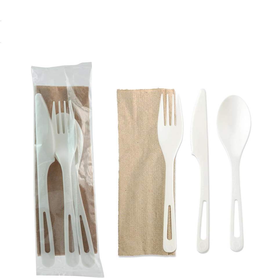 ชุดช้อนส้อมแบบใช้แล้วทิ้งเป็นมิตรต่อสิ่งแวดล้อมแบบรีไซเคิลได้ช้อนส้อมมีดผ้าเช็ดปากสำหรับมื้ออาหารของสายการบิน