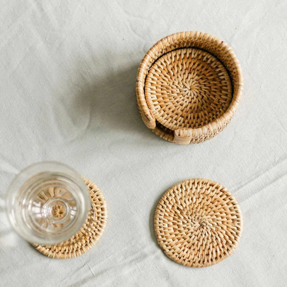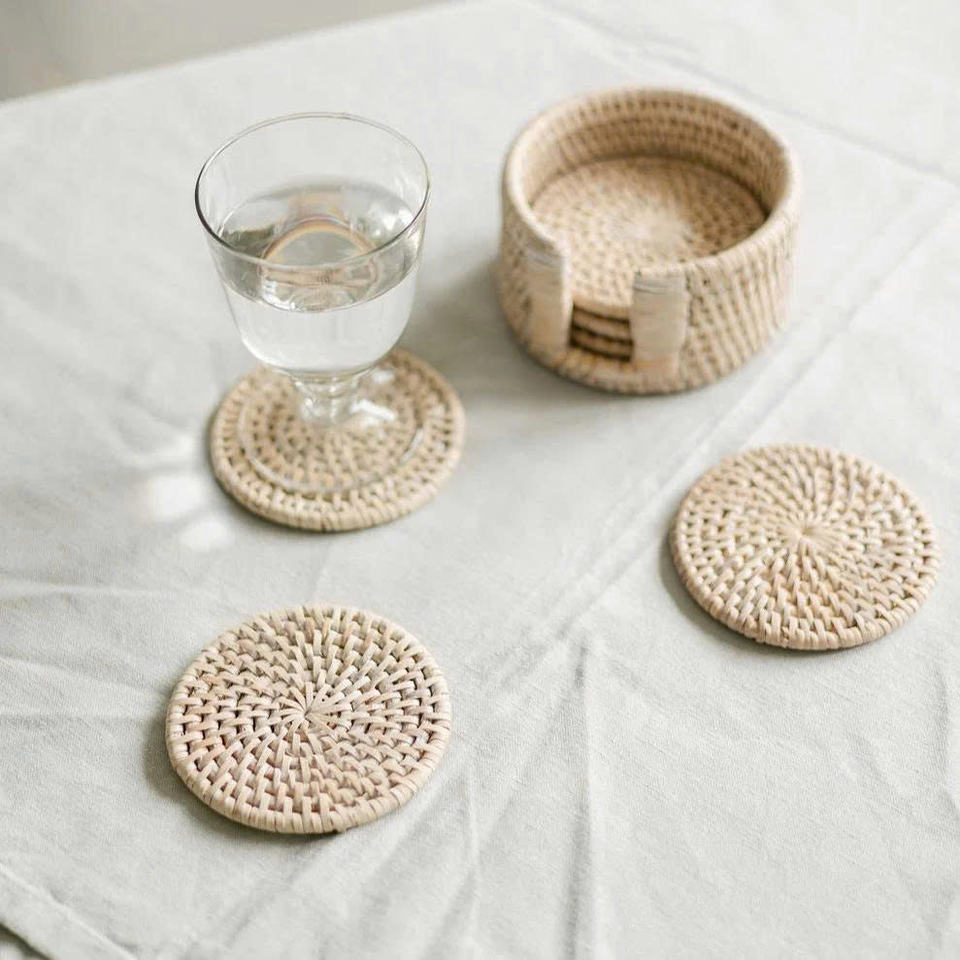 ชุดจานรองแก้วหวายทำมือแบบยั่งยืน สำหรับเครื่องดื่ม ขายส่ง ผู้จัดจำหน่ายแผ่นรองจานและจานรองแก้ว
