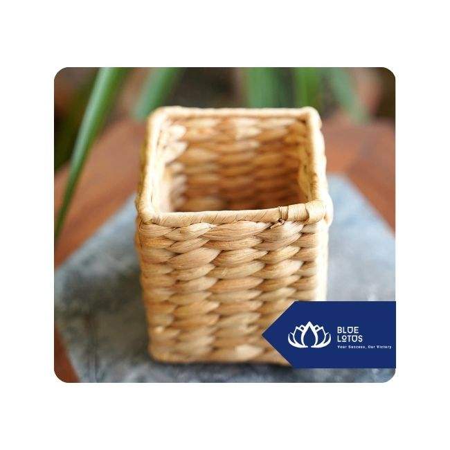 กระถางต้นไม้ในร่มที่ยั่งยืนซึ่งสร้างขึ้นจากผักตบชวาโดยช่างฝีมือดอกบัวสีน้ำเงิน