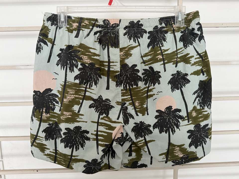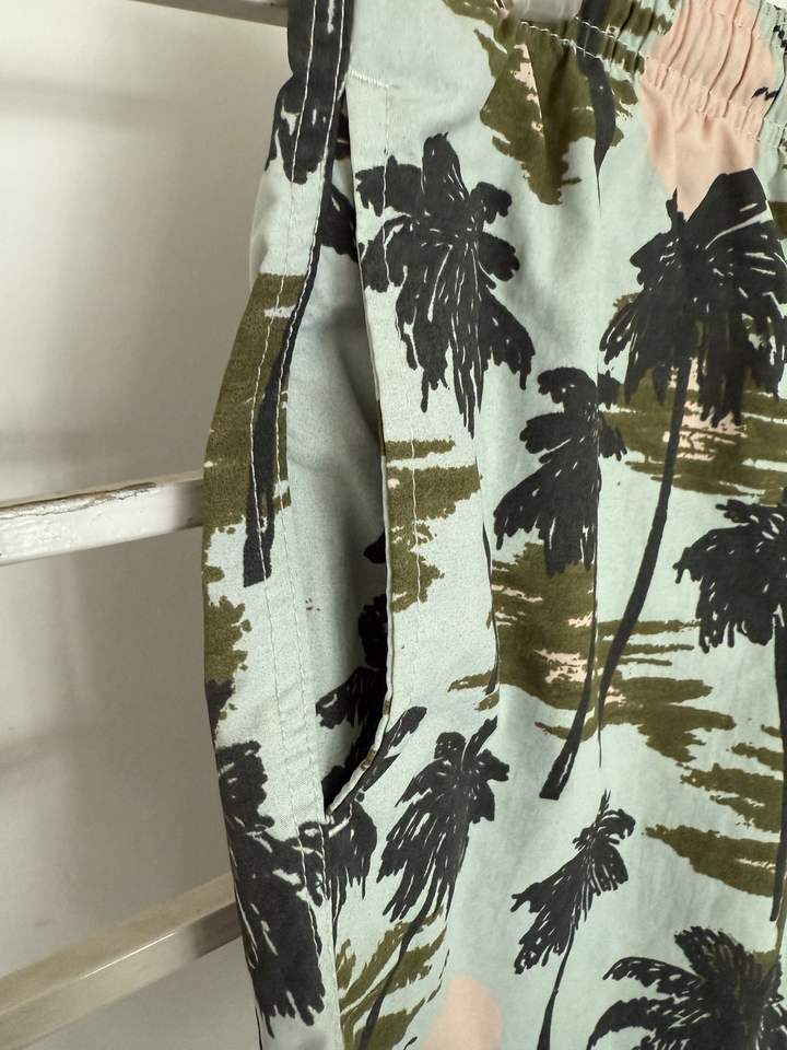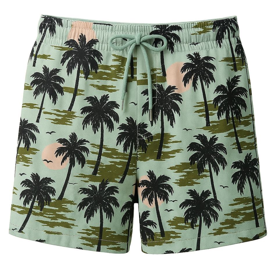 กางเกงว่ายน้ำขาสั้นผ้าโพลีเอสเตอร์แห้งเร็วของผู้ชายกางเกงขาสั้นแนววินเทจแบบลำลองที่ยั่งยืนมีคุณสมบัติป้องกันริ้วรอยระบบดิจิทัล AOP แบบ100%