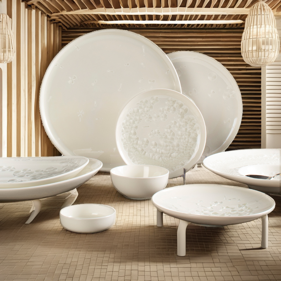 ชุดอาหารเย็นเซรามิกพอร์ซเลนสีขาวแบบยั่งยืน จานลายเกล็ดหิมะเคลือบสีด้วยเทคนิคการเผาในเตา ดีไซน์ทันสมัย