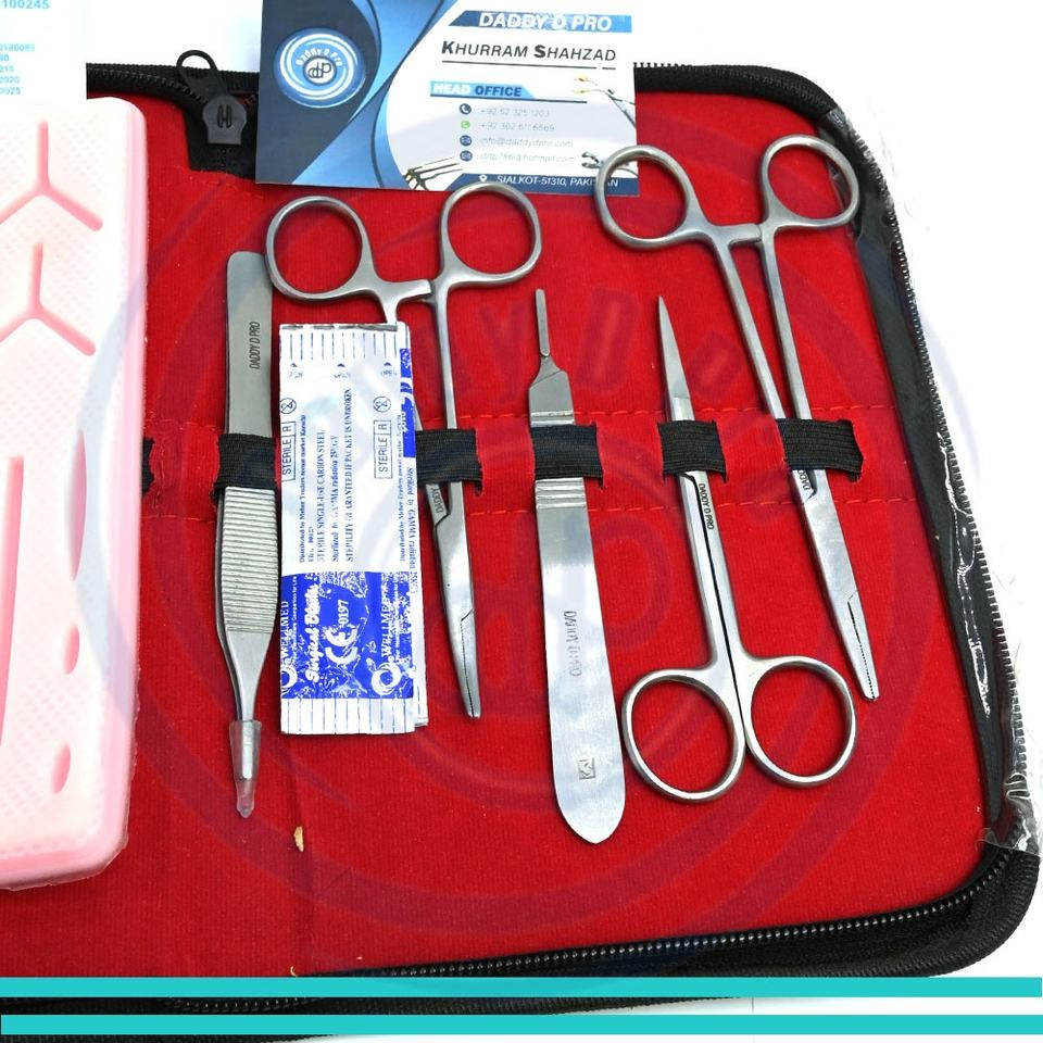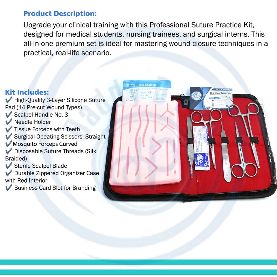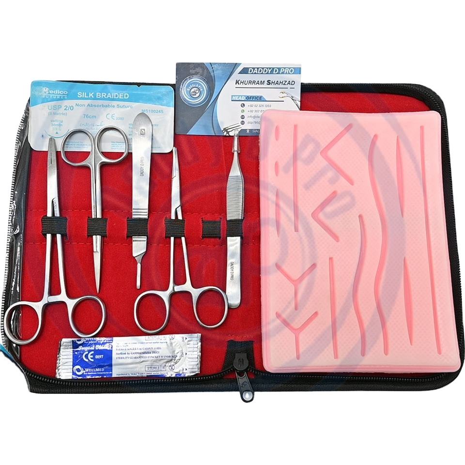 ชุดฝึกหัดเย็บแผลสำหรับนักศึกษาแพทย์ ประกอบด้วยแผ่นซิลิโคนขนาดใหญ่ ชุดอุปกรณ์เย็บแผล แผ่นผูกปม และหลักสูตรวิดีโอสอนการเย็บแผล