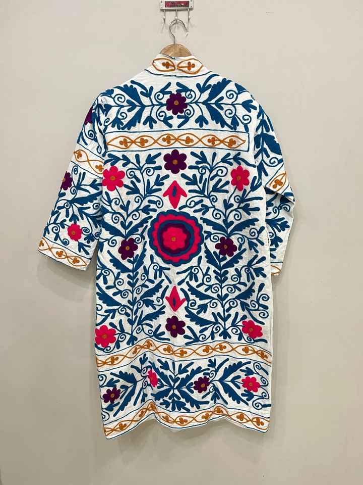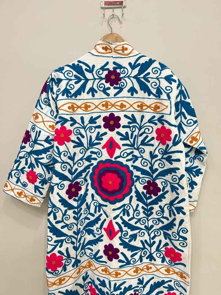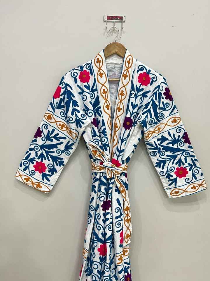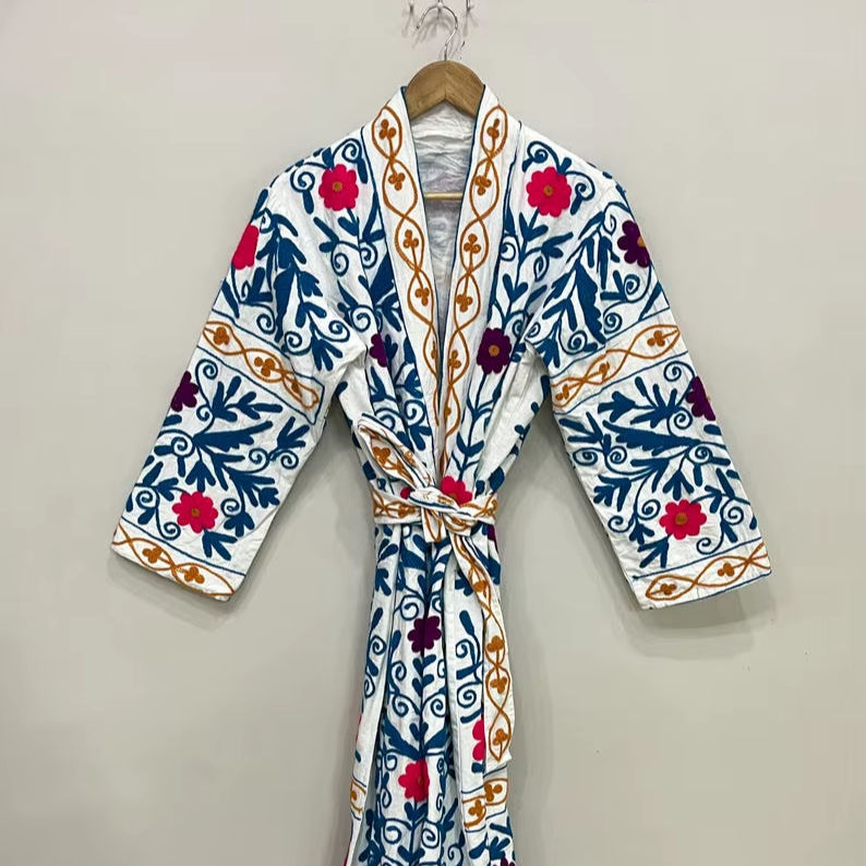 Suzani แจ็คเก็ตปักลายสำหรับผู้หญิง, เสื้อโค้ทตัวยาวทำจากผ้าฝ้ายทำด้วยมือชุดกิโมโนของขวัญสำหรับผู้หญิง
