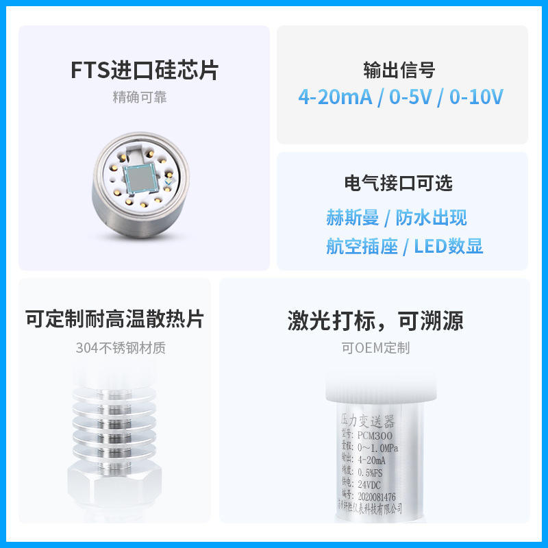 Suzhou เซนเซอร์ซิลิกอนแบบกระจายสแตนเลส4-20mA 0-1MPa เครื่องส่งสัญญาณความดัน PCM300H