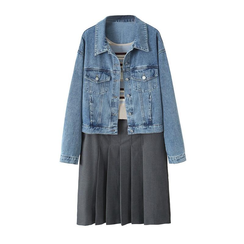 ชุดเสื้อแจ็คเก็ตยีนส์และกระโปรงจีบสำหรับผู้หญิงซูโจว สีฟ้าอ่อน ผ้าฝ้าย ไซส์พลัส แขนยาว ดีไซน์กระเป๋า รุ่น N8578