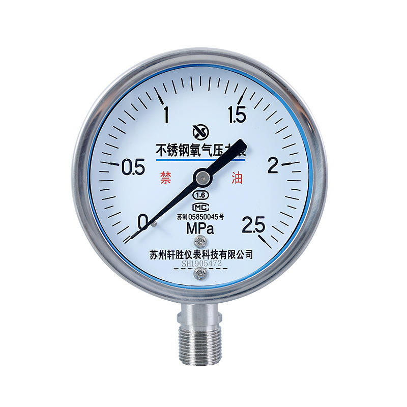 เกจวัดแรงดันออกซิเจนสแตนเลสซูโจวซวนเซิง ขนาด 100 มม. แบบอนาล็อก พร้อมเกลียวเชื่อมต่อ วัดหน่วยเป็น MPa