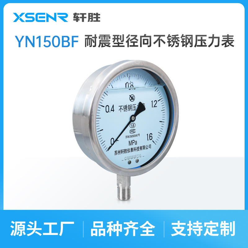 เกจวัดแรงดันสแตนเลสซูโจวซวนเซิง รุ่น YN150BF ขนาด 150 มม. แบบอนาล็อก 0 ถึง 1.6Mpa พร้อมเกลียวเชื่อมต่อ