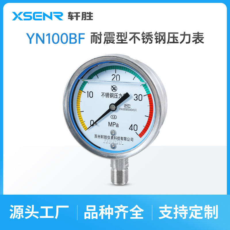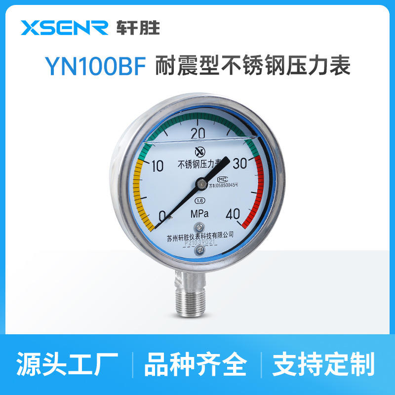 เกจวัดแรงดันสแตนเลสซูโจว ซวนเฉิง รุ่น YN100BF ขนาด 100 มม. แบบอนาล็อก 0-40Mpa พร้อมเกลียวเชื่อมต่อ วงแหวนสีเตือน