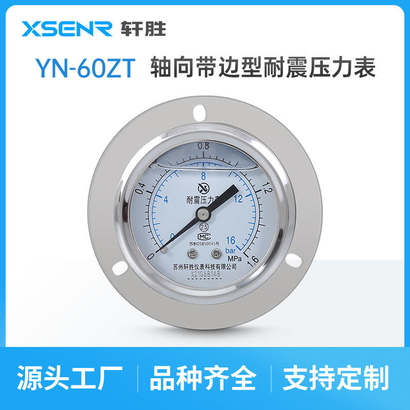 เกจวัดแรงดันแบบติดตั้งบนแผง Suzhou Xuansheng YN60ZT ทนทานต่อแรงสั่นสะเทือนแกน ขนาด 60 มม. ทำจากสแตนเลส ความแม่นยำ 2.5 บาร์ หน่วยเป็น MPa
