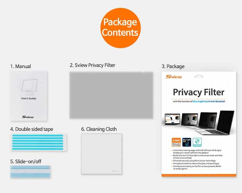 Sview Package + Privacy Filter + Manual + Cleaning Cloth + Hang-Tab+Double-sided Tape