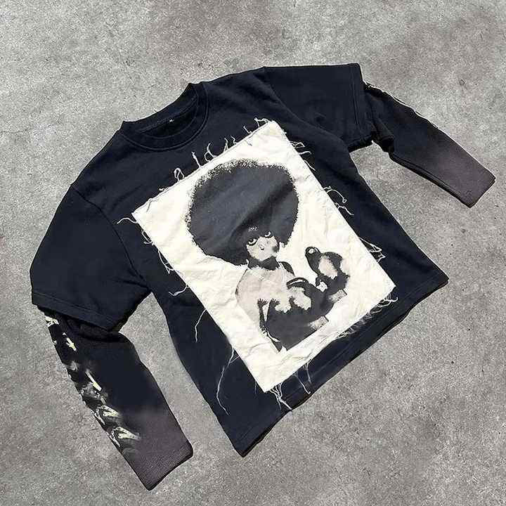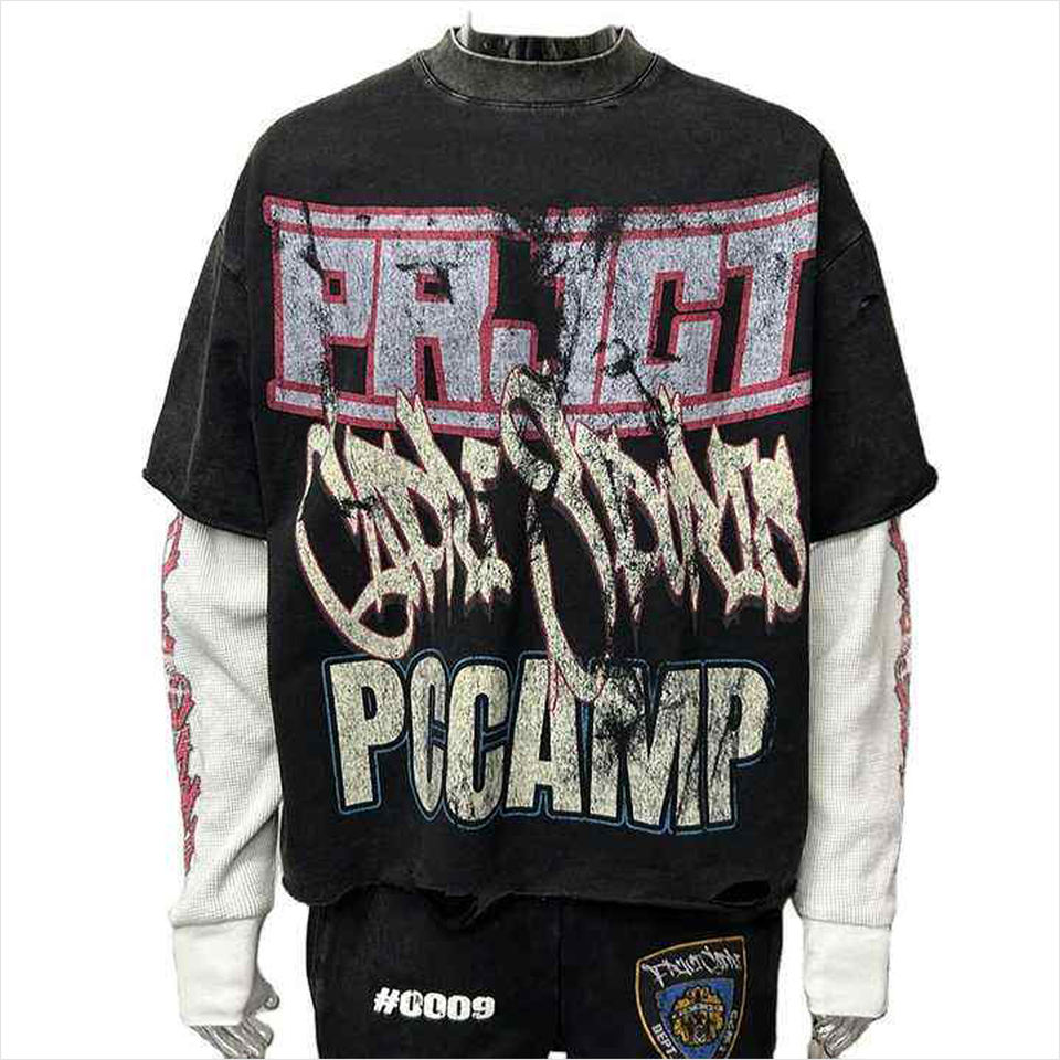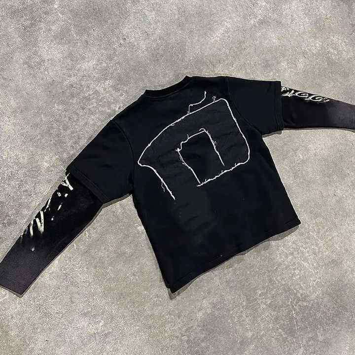 เสื้อสเวตเชิ้ตพิมพ์ลายกราฟิกแบบกำหนดเอง ทรงบ็อกซี่ แขนยาวสองชั้น ปักลาย สกรีนลาย ผ้าคอตตอนหนา เสื้อยืดครอปผู้ชาย