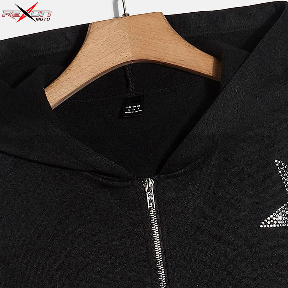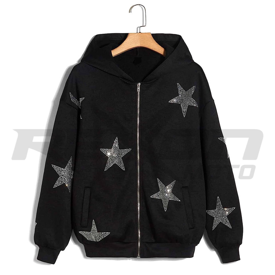 เสื้อสเวตเตอร์มีฮู้ดสำหรับผู้หญิงลายดาวประดับพลอยเทียมมีซิปเปิดไหล่มีฮู้ดเสื้อผ้าแนวสตรีทฮิปฮอปสำหรับผู้ชาย