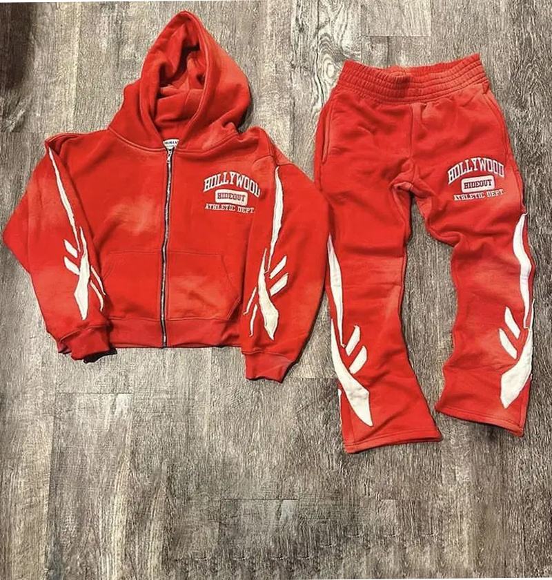Sweatsuit Manufacturers French Terry Distressed Acid Wash Zip up Applique Patch Embroidery Flare Sweatpant and Hoodie Sweatsuits