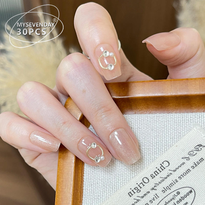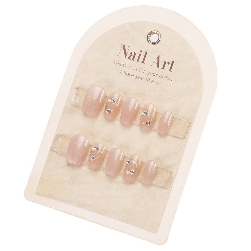 Sweet Cool Spicy Girl Wearable Nails Fresh Nude Pink Glitter Dia Metal Ring Cat Eye Girly Style Nail Stickers 30 Pieces