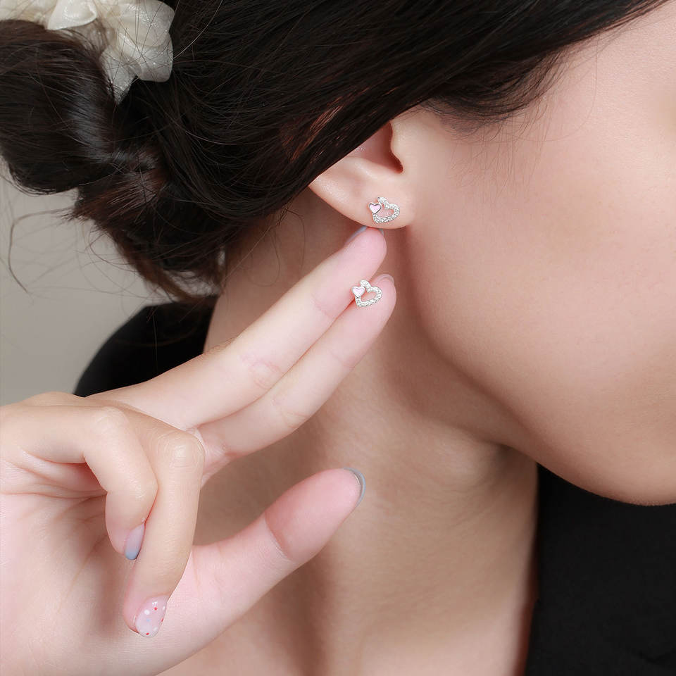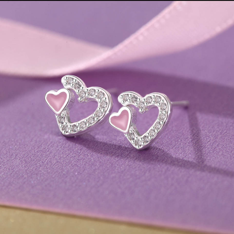 Sweet Everyday Jewelry Sterling Silver 925 CZ Double Heart Stud Earrings