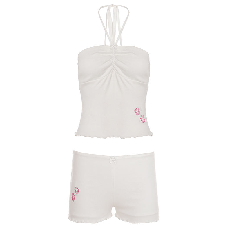 ชุดเสื้อครอปคอ halter ปักลายดอกไม้หวานๆ พร้อมกางเกงขาสั้นเข้าชุด - ผ้าถักเนื้อนุ่ม ระบายอากาศได้ดี กันน้ำ ผลิตจากผ้าสแปนเด็กซ์/โพลีเอสเตอร์ ความยาวระดับเข่า